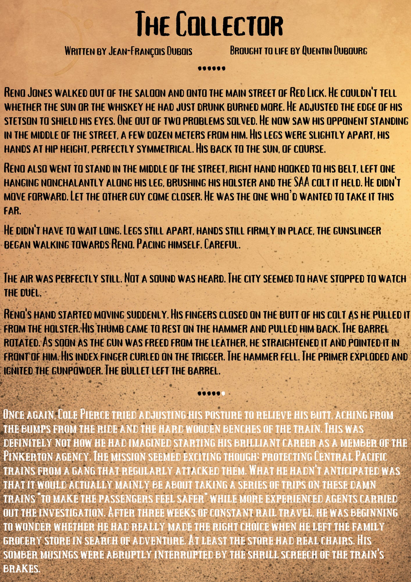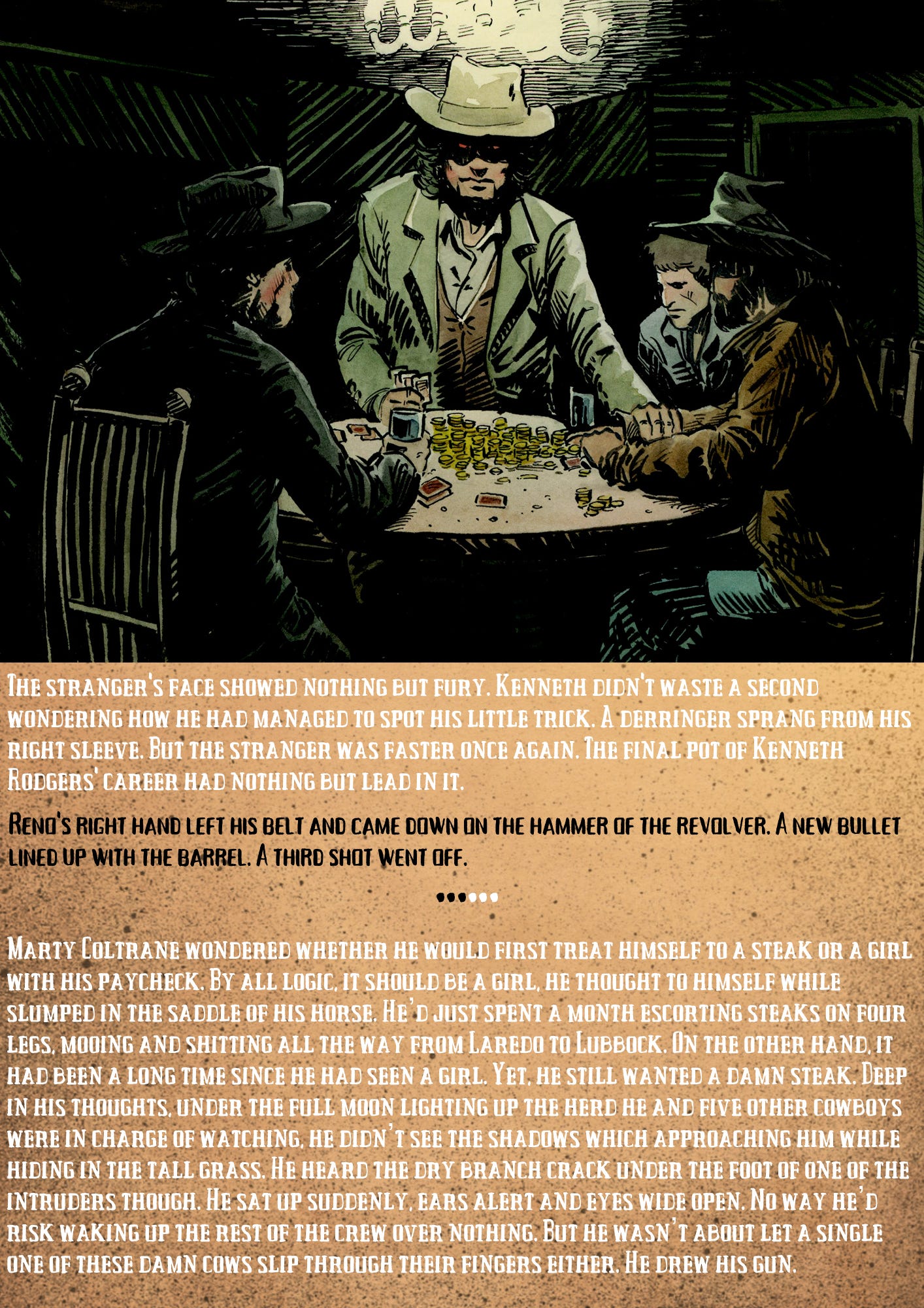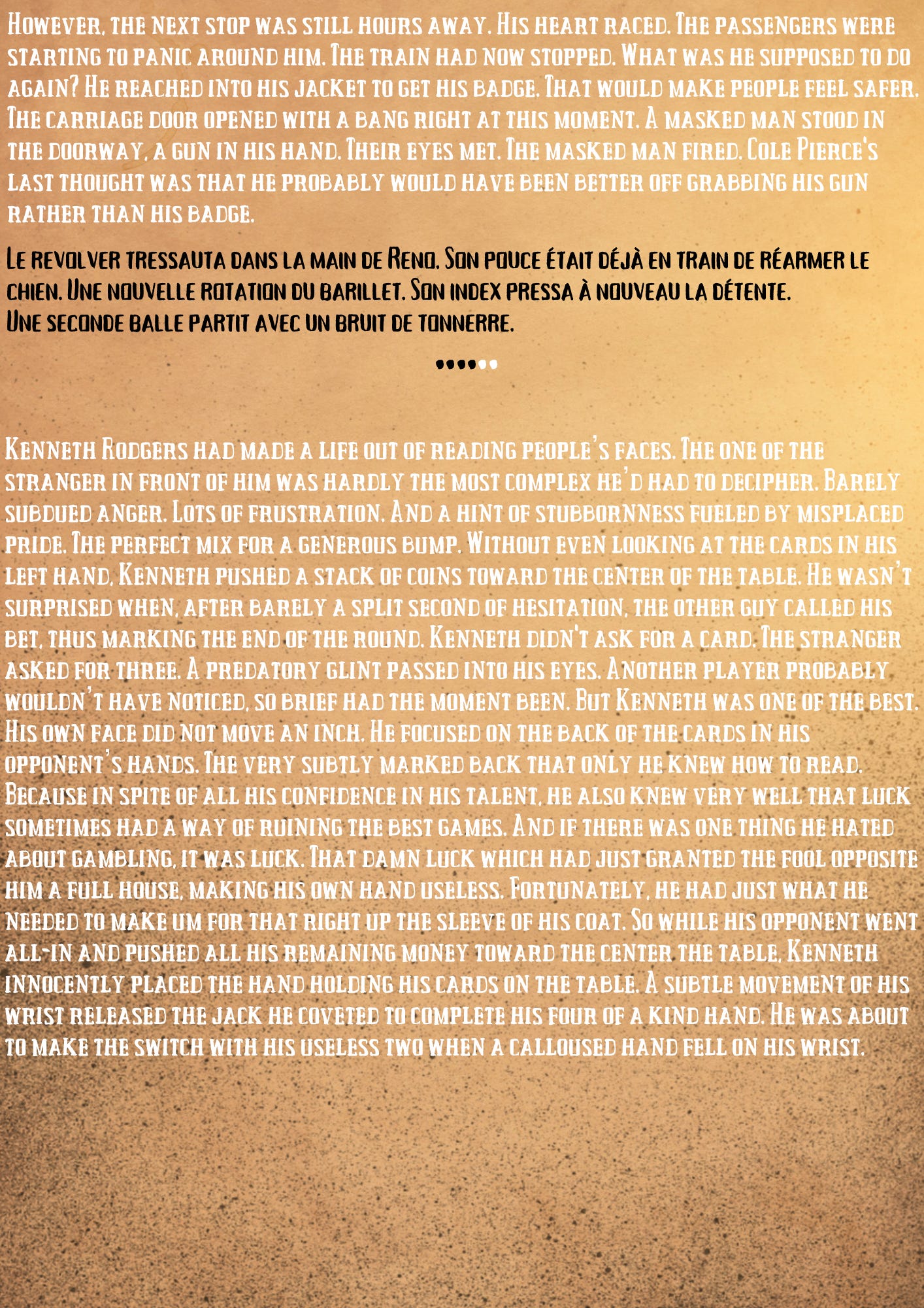 The Old West. A land of endless possibilities. A time when crossing paths with the wrong stranger could end your life. One of those strangers just challenged Reno Jones to a duel. Not Reno’s first, but will it be his last? And what do a security guard, a poker player, a cowboy, a whore, a marshal and a teacher can have in common except from living (and eventually dying) during these challenging times?